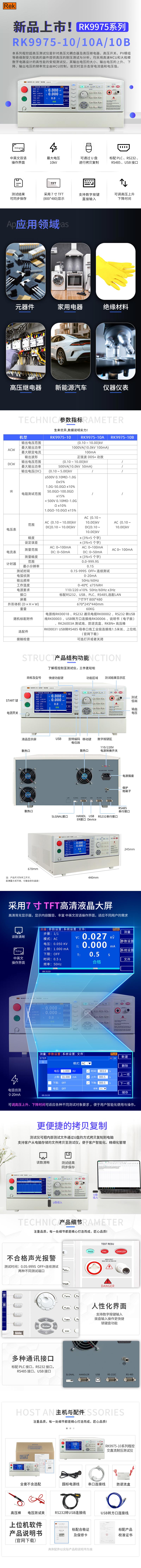 本系列程控超高压测试仪是针对高压光耦合器及高压继电器、高压开关、PV模组等绝缘耐受力较高的器件提供高压的耐压测试与分析,均采用高速MCU和大规模数字电路设计的高性能的安规测试仪,其输出电压的大小、输出电压的上升、下降、输出电压的频率完全由MCU控制,能实时显示击穿电流值和电压值,并具有无线遥控功能,配备PLC、RS232C、RS485、USB、LAN接口,方便与计算机或PLC系统组成综合测试系统。能够快速、准确地对家用电器、仪器仪表、照明电器、电动电热工具、计算机、信息类整机进行安规测量。
