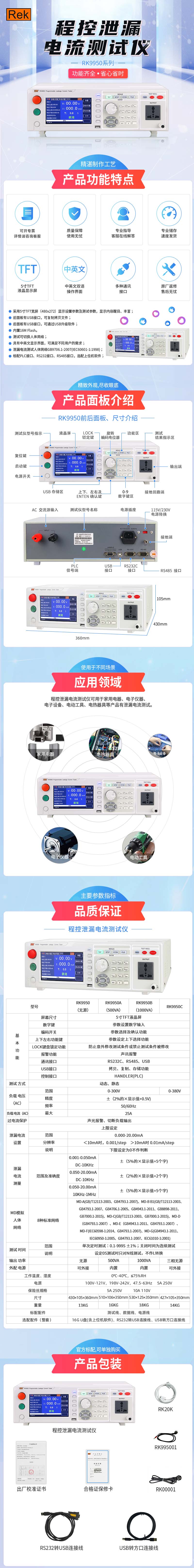 RK9950C程控泄漏电流测试仪为5寸TFT液晶屏显示,测试仪采用32位高速MCU和大规模数字电路设计,内置GB9706.1-2007(IEC60601-1:1998)人体阻抗模拟网络,板卡式MD网络接口包含MD-A(符合GB/T12113-2003、GB4793.1-2007)、MD-B(符合GB/T12113-2003、GB4793.1-2007、GB4706.1-2005、GB4943.1-2011、GB8898-2011、GB7000.1-2015)、MD-C(符合GB/T12113-2003、GB7000.1-2015)、MD-D(符合GB4793.1-2007)、MD-E(符合GB4943.1-2011、GB4793.1-2007)、MD-F(符合GB7000.1-2015)。负载电压、电流超限保护;MD网络多重快速保护,安全可靠。动态、静态两种电源测试状态;泄漏电流测试对L(相线)、N(零线)自动切换。