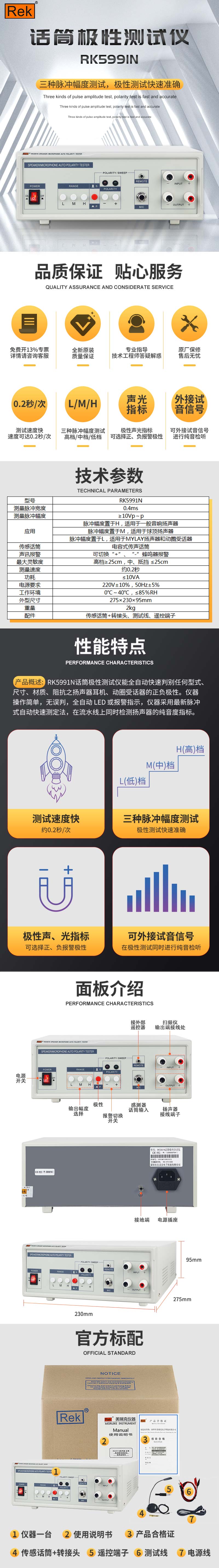 RK5991N话筒极性测试仪能全自动快速判别任何型式、尺寸、材质、阻抗之扬声器耳机、动圈受话器的正负极性。仪器操作简单,绝无误判,全自动 LED 或报警指示,仪器采用最新脉冲式自动快速测定法,在流水线上同时检测扬声器的纯音度指标。