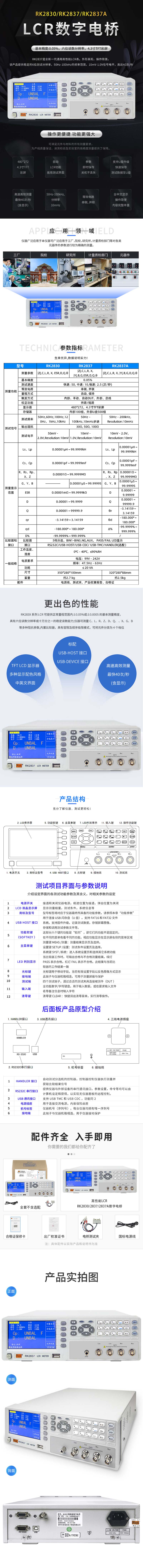 RK2837是全新一代通用高性能LCR表。外形美观,操作简便。该产品提供稳定的6位测试分辨率,50Hz-100kHz的频率范围,10mV-1.0V信号电平,高达40次/秒,可满足元件与材料的所有测量要求,为产线质量保证、进货检验及实验室的高精度测量提供了保障。